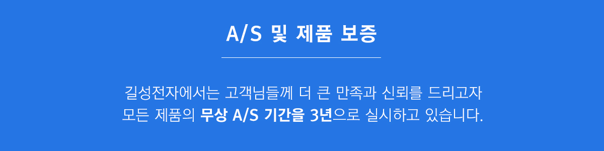 ±æ¼ºÀüÀÚÀÇ ¸ðµç Á¦Ç°ÀÇ ¹«»ó A/S ǰÁúº¸Áõ±â°£Àº 3³âÀÔ´Ï´Ù.´Ü, ¼ÒºñÀÚÀÇ °ú½Ç·Î °íÀåÀÌ ¹ß»ýÇÑ °æ¿ì ¹«»ó A/S¿¡ ÇØ´çµÇÁö ¾Ê½À´Ï´Ù.* ¼ÒºñÀÚ °ú½Ç·Î ÀÎÇÑ °íÀåÀ¸·Î Á¦Ç° ¼ö¸®°¡ °¡´ÉÇÒ °æ¿ì [À¯»ó¼ö¸®]* ¼ÒºñÀÚ °ú½Ç·Î ÀÎÇÑ °íÀåÀ¸·Î Á¦Ç° ¼ö¸®°¡ ºÒ°¡´ÉÇÒ °æ¿ì [À¯»ó¼ö¸®¿¡ ÇØ´çÇÏ´Â ±Ý¾× ¡¼ö ÈÄ Á¦Ç° ±³È¯] [¹«»ó ¼ºñ½º]* º¸Áõ±â°£ À̳»¿¡ Á¤»óÀûÀÎ »ç¿ë »óÅ¿¡¼ ¹ß»ýÇÑ °íÀåÀº ¹«»ó¼ö¸®¸¦ ¹ÞÀ» ¼ö ÀÖ½À´Ï´Ù.* ±¸ÀÔ ÈÄ 10ÀÏ À̳»¿¡ Áß¿äÇÑ ¼ö¸®¸¦ ÇØ¾ß ÇÒ °æ¿ì Á¦Ç°±³È¯ ¶Ç´Â ȯ±Þ¹ÞÀ» ¼ö ÀÖ½À´Ï´Ù.* ±¸ÀÔ ÈÄ 1°³¿ù À̳»¿¡ Áß¿äÇÑ ¼ö¸®¸¦ ÇØ¾ß ÇÒ °æ¿ì Á¦Ç°±³È¯ ¶Ç´Â ¹«»ó¼ö¸® ¹ÞÀ» ¼ö ÀÖ½À´Ï´Ù.[À¯»ó ¼ºñ½º]* »ç¿ëÀÚÀÇ ºÎÁÖÀÇ(ħ¼ö,ÆÄ¼Õ,¼Õ»ó)·Î °íÀåÀÌ ¹ß»ýÇÏ´Â °æ¿ì ±×¿¡ ÇØ´çÇÏ´Â ºñ¿ëÀÌ ¹ß»ýµË´Ï´Ù.* »ç¿ë¼³¸í¼ÀÇ 'ÁÖÀÇ»çÇ×'À» ÁöŰÁö ¾Ê¾Æ °íÀåÀÌ ¹ß»ýÇÑ °æ¿ì ¹«»ó A/S ´ë»ó¿¡¼ Á¦¿ÜµË´Ï´Ù.* õÀçÁöº¯(ÈÀç,¼öÇØ,¿°ÇØ,³«·Ú µî)¿¡ ÀÇÇÑ °íÀåÀÌ ¹ß»ýÇÑ °æ¿ì ºñ¿ëÀÌ ¹ß»ýµÉ ¼ö ÀÖ½À´Ï´Ù.* ¼Ò¸ð¼º ºÎǰÀÇ ¼ö¸íÀÌ ´ÙÇÑ °æ¿ì ¹«»ó A/S°¡ ºÒ°¡ÇÕ´Ï´Ù.À¯»ó¼ö¸®¿¡ ÇØ´çÇÏ´Â ¸ðµç »çÇ×Àº Á¦Ç° ¼ö¸®°¡ °¡´ÉÇÒ °æ¿ì À¯»óÀ¸·Î Á¦Ç°À» ¼ö¸®¹ÞÀ» ¼ö ÀÖÀ¸¸ç, Á¦Ç° ¼ö¸®°¡ ºÒ°¡´ÉÇÒ °æ¿ì À¯»ó¼ö¸®¿¡ ÇØ´çÇÏ´Â ±Ý¾× ¡¼ö ÈÄ Á¦Ç°À» ±³È¯Çص帳´Ï´Ù.[¼ºñ½º °ÅºÎ]ÀÓÀÇ·Î °³Á¶ ¹× ¼ö¸®¸¦ ÇÏ¿© °íÀåÀÌ ¹ß»ýÇÒ °æ¿ì ¼ºñ½º ´ë»ó¿¡¼ Á¦¿ÜµÉ ¼ö ÀÖ½À´Ï´Ù.[A/S ¼¾ÅÍ À§Ä¡ ¹× ¹®ÀÇ]* ¹®ÀÇÀüÈ/ 02-2602-2918* º»»çÀ§Ä¡/ ¼¿ï ¾çõ±¸ ½ÅÁ¤Áß¾Ó·Î 58 È￵ÁÖ»óº¹ÇÕºôµù 1Ãþ ±æ¼ºÀüÀÚ